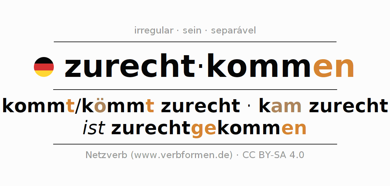 A conjugação do verbo zurecht·kommen é apresentada online assim como a Tabela de Verbo com todas as formas verbais no singular e no plural, e em todas as pessoas (1ª pessoa, 2ª pessoa, 3ª pessoa) A flexão do verbo zurecht·kommen é portanto, uma ajuda para os trabalhos de casa, testes, exames, aulas de alemão, para o estudo do alemão como língua estrangeira, como segunda língua e também na formação de adultos. Especialmente no aprendizado do alemão é importante a conjugação correta do verbo com as respectivamente formas flexionadas corretamente (kommt/kömmt zurecht - kam zurecht - ist zurechtgekommen). Mais informações podem ser encontradas no Wiktionary zurechtkommen e no Duden zurechtkommen.