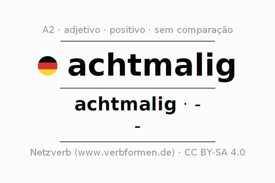 A declinação do adjetivo achtmalig não forma o grau de comparação achtmalig. O adjectivo não tem forma no comparativo e nem no superlativo. O adjectivo achtmalig pode ser utilizado tanto como atributivo antes de um substantivo ou como predicativo junto com um verbo.Não se pode flexionar e comparar somente o adjetivo achtmalig, mas sim todos os adjetivos em alemão. Comentários ☆