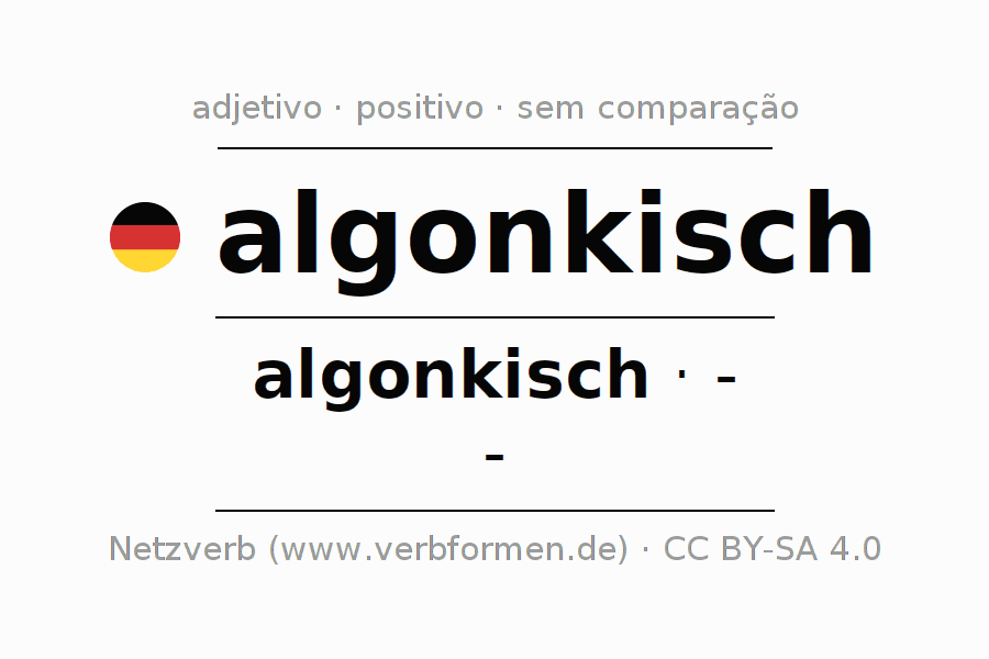 A declinação do adjetivo algonkisch não forma o grau de comparação algonkisch. O adjectivo não tem forma no comparativo e nem no superlativo. O adjectivo algonkisch pode ser utilizado tanto como atributivo antes de um substantivo ou como predicativo junto com um verbo.Não se pode flexionar e comparar somente o adjetivo algonkisch, mas sim todos os adjetivos em alemão. Comentários ☆