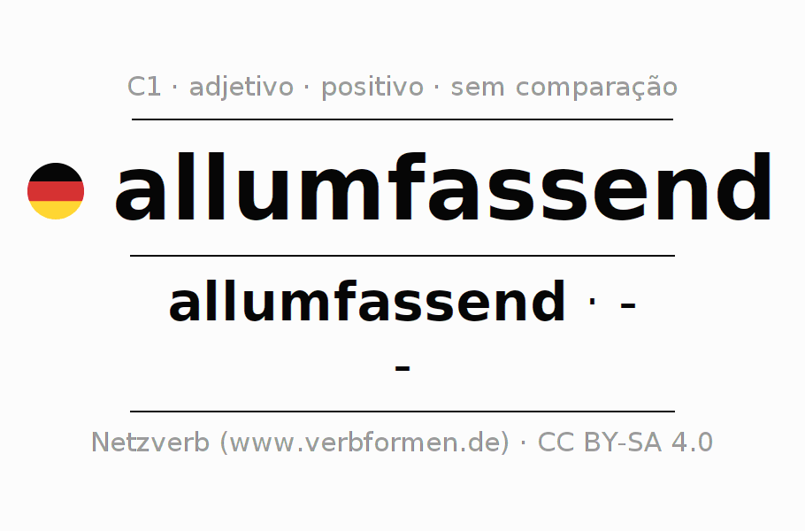 A declinação do adjetivo allumfassend não forma o grau de comparação allumfassend. O adjectivo não tem forma no comparativo e nem no superlativo. O adjectivo allumfassend pode ser utilizado tanto como atributivo antes de um substantivo ou como predicativo junto com um verbo.Não se pode flexionar e comparar somente o adjetivo allumfassend, mas sim todos os adjetivos em alemão. Comentários ☆