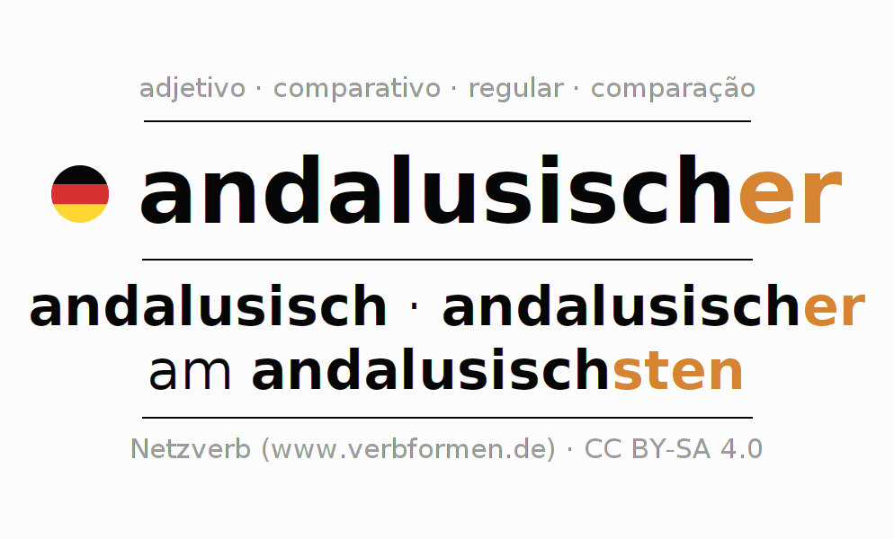 A declinação do adjetivo andalusischer (andaluz) utiliza as seguintes formas de comparação andalusisch,andalusischer,am andalusischsten. As terminações para o comparativo e o superlativo são er/sten. O adjectivo andalusischer pode ser utilizado tanto como atributivo antes de um substantivo ou como predicativo junto com um verbo.Não se pode flexionar e comparar somente o adjetivo andalusischer, mas sim todos os adjetivos em alemão. Comentários ☆