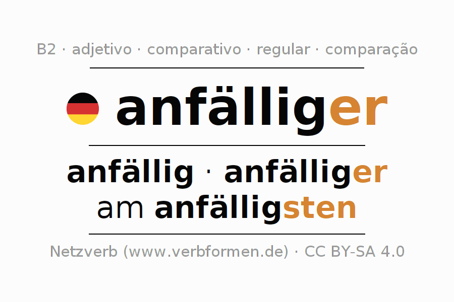 A declinação do adjetivo anfälliger (susceptível, vulnerável) utiliza as seguintes formas de comparação anfällig,anfälliger,am anfälligsten. As terminações para o comparativo e o superlativo são er/sten. O adjectivo anfälliger pode ser utilizado tanto como atributivo antes de um substantivo ou como predicativo junto com um verbo.Não se pode flexionar e comparar somente o adjetivo anfälliger, mas sim todos os adjetivos em alemão. Comentários ☆