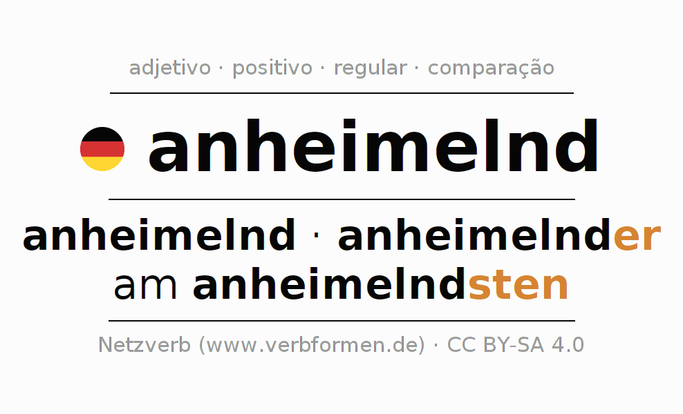 A declinação do adjetivo anheimelnd (acolhedor, aconchegante) utiliza as seguintes formas de comparação anheimelnd,anheimelnder,am anheimelndsten. As terminações para o comparativo e o superlativo são er/sten. O adjectivo anheimelnd pode ser utilizado tanto como atributivo antes de um substantivo ou como predicativo junto com um verbo.Não se pode flexionar e comparar somente o adjetivo anheimelnd, mas sim todos os adjetivos em alemão. Comentários ☆