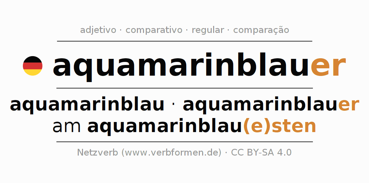 A declinação do adjetivo aquamarinblauer (aqua, azul água-marinha) utiliza as seguintes formas de comparação aquamarinblau,aquamarinblauer,am aquamarinblauesten. As terminações para o comparativo e o superlativo são er/esten. O adjectivo aquamarinblauer pode ser utilizado tanto como atributivo antes de um substantivo ou como predicativo junto com um verbo.Não se pode flexionar e comparar somente o adjetivo aquamarinblauer, mas sim todos os adjetivos em alemão. Comentários ☆