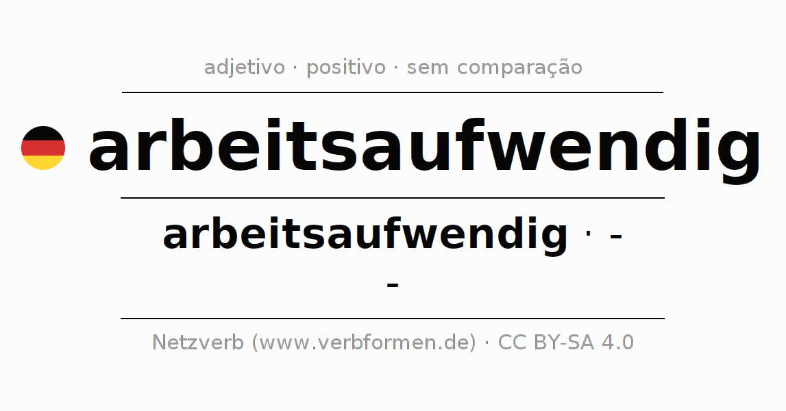 A declinação do adjetivo arbeitsaufwendig não forma o grau de comparação arbeitsaufwendig. O adjectivo não tem forma no comparativo e nem no superlativo. O adjectivo arbeitsaufwendig pode ser utilizado tanto como atributivo antes de um substantivo ou como predicativo junto com um verbo.Não se pode flexionar e comparar somente o adjetivo arbeitsaufwendig, mas sim todos os adjetivos em alemão. Comentários ☆