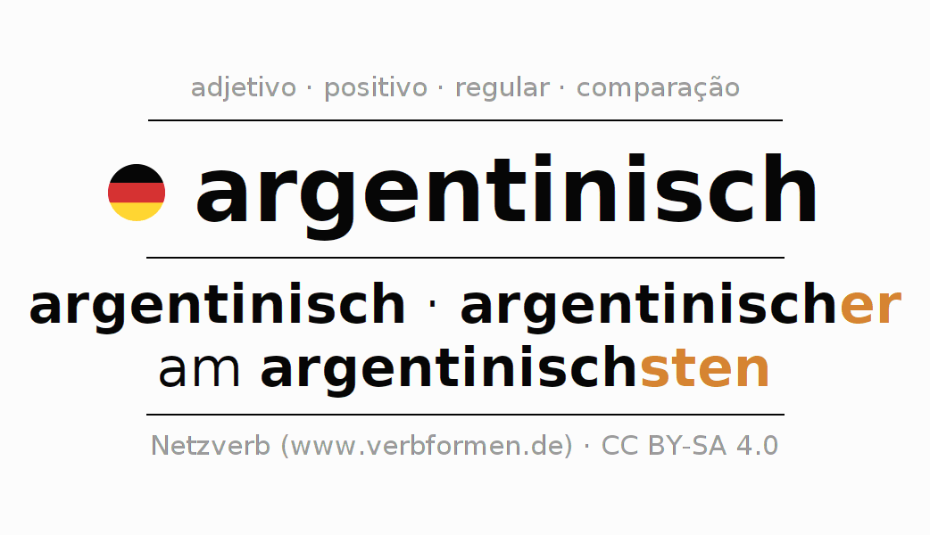 A declinação do adjetivo argentinisch (argentino) utiliza as seguintes formas de comparação argentinisch,argentinischer,am argentinischsten. As terminações para o comparativo e o superlativo são er/sten. O adjectivo argentinisch pode ser utilizado tanto como atributivo antes de um substantivo ou como predicativo junto com um verbo.Não se pode flexionar e comparar somente o adjetivo argentinisch, mas sim todos os adjetivos em alemão. Comentários ☆