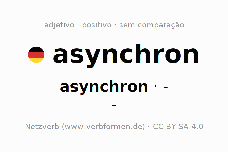 A declinação do adjetivo asynchron não forma o grau de comparação asynchron. O adjectivo não tem forma no comparativo e nem no superlativo. O adjectivo asynchron pode ser utilizado tanto como atributivo antes de um substantivo ou como predicativo junto com um verbo.Não se pode flexionar e comparar somente o adjetivo asynchron, mas sim todos os adjetivos em alemão. Comentários ☆