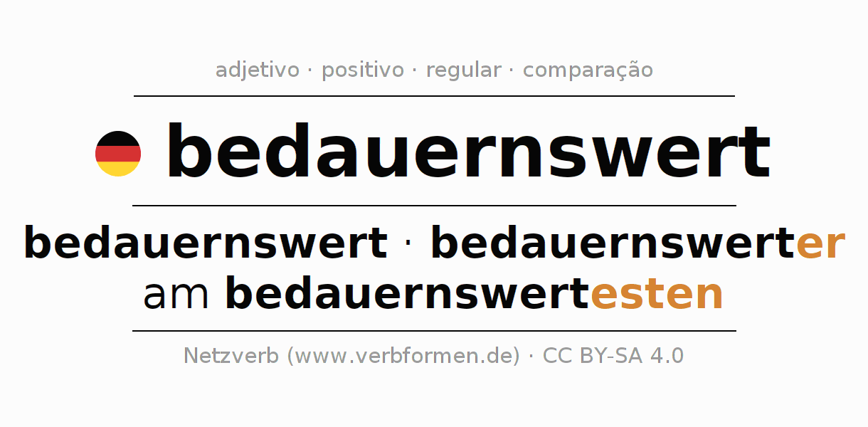 A declinação do adjetivo bedauernswert (deplorável, lamentável) utiliza as seguintes formas de comparação bedauernswert,bedauernswerter,am bedauernswertesten. As terminações para o comparativo e o superlativo são er/esten. O adjectivo bedauernswert pode ser utilizado tanto como atributivo antes de um substantivo ou como predicativo junto com um verbo.Não se pode flexionar e comparar somente o adjetivo bedauernswert, mas sim todos os adjetivos em alemão. Comentários ☆