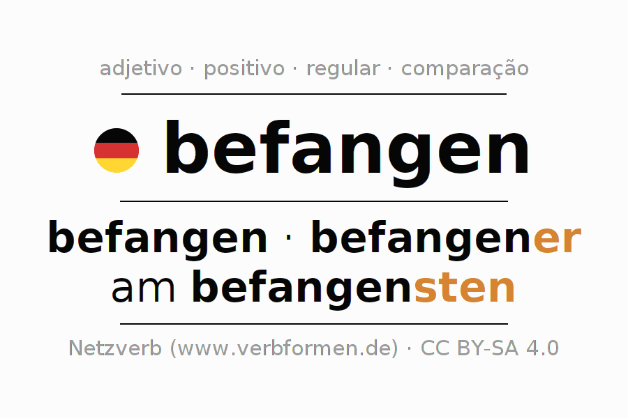 A declinação do adjetivo befangen (parcial, comprometido) utiliza as seguintes formas de comparação befangen,befangener,am befangensten. As terminações para o comparativo e o superlativo são er/sten. O adjectivo befangen pode ser utilizado tanto como atributivo antes de um substantivo ou como predicativo junto com um verbo.Não se pode flexionar e comparar somente o adjetivo befangen, mas sim todos os adjetivos em alemão. Comentários ☆
