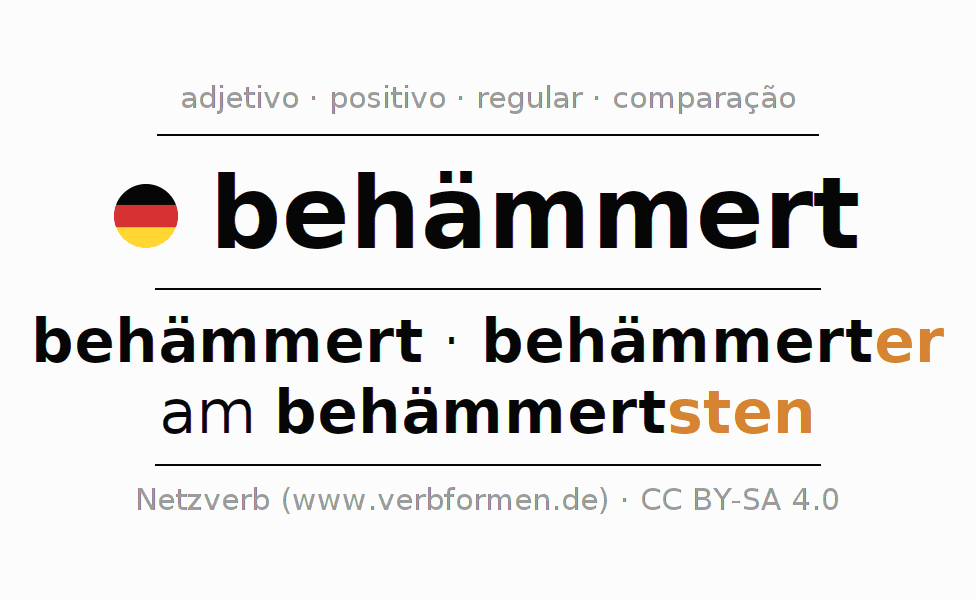 A declinação do adjetivo behämmert (atordoado, bobo) utiliza as seguintes formas de comparação behämmert,behämmerter,am behämmertsten. As terminações para o comparativo e o superlativo são er/sten. O adjectivo behämmert pode ser utilizado tanto como atributivo antes de um substantivo ou como predicativo junto com um verbo.Não se pode flexionar e comparar somente o adjetivo behämmert, mas sim todos os adjetivos em alemão. Comentários ☆