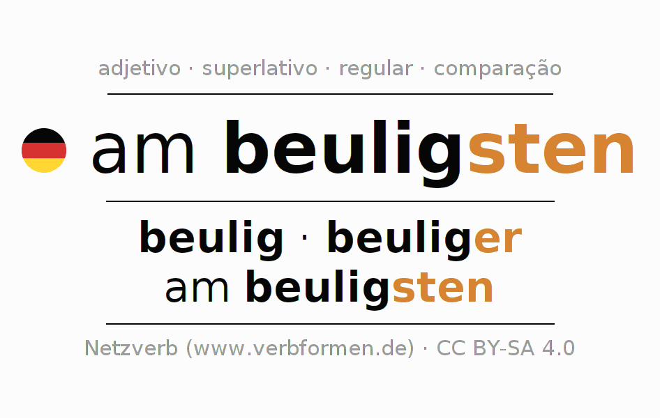 A declinação e o comparativo de am beuligsten são apresentados online em tabelas em todas as formas: forte, fraca e mista. Assim como no singular e no plural. Também são apresentados os 4 casos: nominativo (auch 1. Fall, Wer-Fall), genitivo (auch 2. Fall, Wes-Fall, Wessen-Fall), dativo (auch3. Fall, Wem-Fall) e acusativo (auch4. Fall, Wen-Fall). Mais informações podem ser encontradas em Wiktionary am beuligsten e am beuligsten no Duden.
