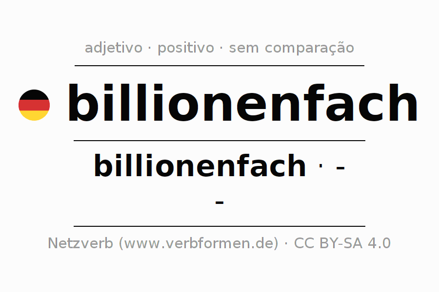 A declinação do adjetivo billionenfach não forma o grau de comparação billionenfach. O adjectivo não tem forma no comparativo e nem no superlativo. O adjectivo billionenfach pode ser utilizado tanto como atributivo antes de um substantivo ou como predicativo junto com um verbo.Não se pode flexionar e comparar somente o adjetivo billionenfach, mas sim todos os adjetivos em alemão. Comentários ☆