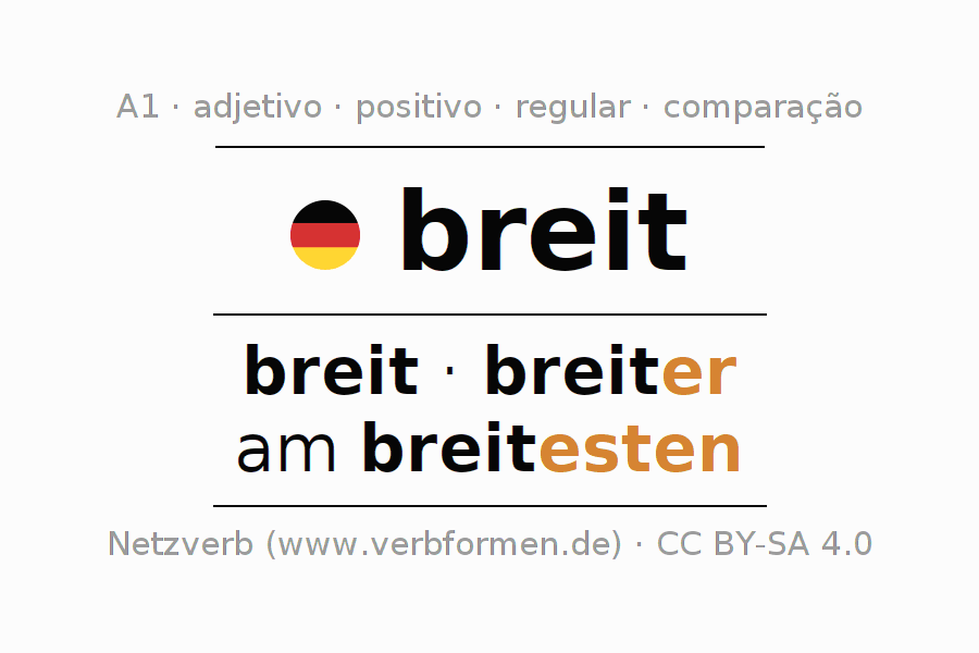 A declinação do adjetivo breit (amplo, largo) utiliza as seguintes formas de comparação breit,breiter,am breitesten. As terminações para o comparativo e o superlativo são er/esten. O adjectivo breit pode ser utilizado tanto como atributivo antes de um substantivo ou como predicativo junto com um verbo.Não se pode flexionar e comparar somente o adjetivo breit, mas sim todos os adjetivos em alemão. Comentários ☆