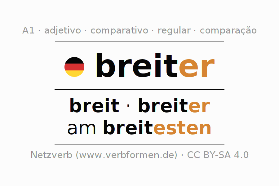 A declinação do adjetivo breiter (amplo, largo) utiliza as seguintes formas de comparação breit,breiter,am breitesten. As terminações para o comparativo e o superlativo são er/esten. O adjectivo breiter pode ser utilizado tanto como atributivo antes de um substantivo ou como predicativo junto com um verbo.Não se pode flexionar e comparar somente o adjetivo breiter, mas sim todos os adjetivos em alemão. Comentários ☆