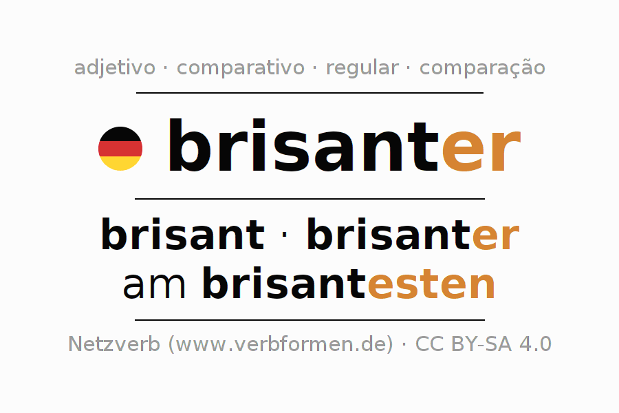 A declinação do adjetivo brisanter (explosivo, contencioso) utiliza as seguintes formas de comparação brisant,brisanter,am brisantesten. As terminações para o comparativo e o superlativo são er/esten. O adjectivo brisanter pode ser utilizado tanto como atributivo antes de um substantivo ou como predicativo junto com um verbo.Não se pode flexionar e comparar somente o adjetivo brisanter, mas sim todos os adjetivos em alemão. Comentários ☆