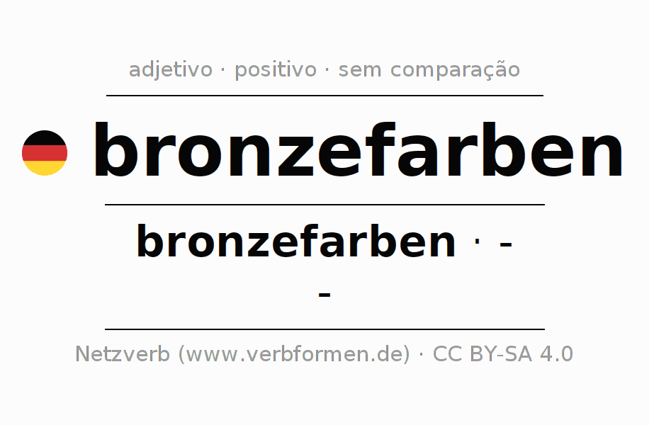 A declinação do adjetivo bronzefarben não forma o grau de comparação bronzefarben. O adjectivo não tem forma no comparativo e nem no superlativo. O adjectivo bronzefarben pode ser utilizado tanto como atributivo antes de um substantivo ou como predicativo junto com um verbo.Não se pode flexionar e comparar somente o adjetivo bronzefarben, mas sim todos os adjetivos em alemão. Comentários ☆