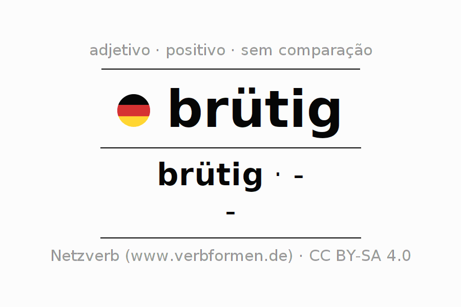A declinação do adjetivo brütig não forma o grau de comparação brütig. O adjectivo não tem forma no comparativo e nem no superlativo. O adjectivo brütig pode ser utilizado tanto como atributivo antes de um substantivo ou como predicativo junto com um verbo.Não se pode flexionar e comparar somente o adjetivo brütig, mas sim todos os adjetivos em alemão. Comentários ☆