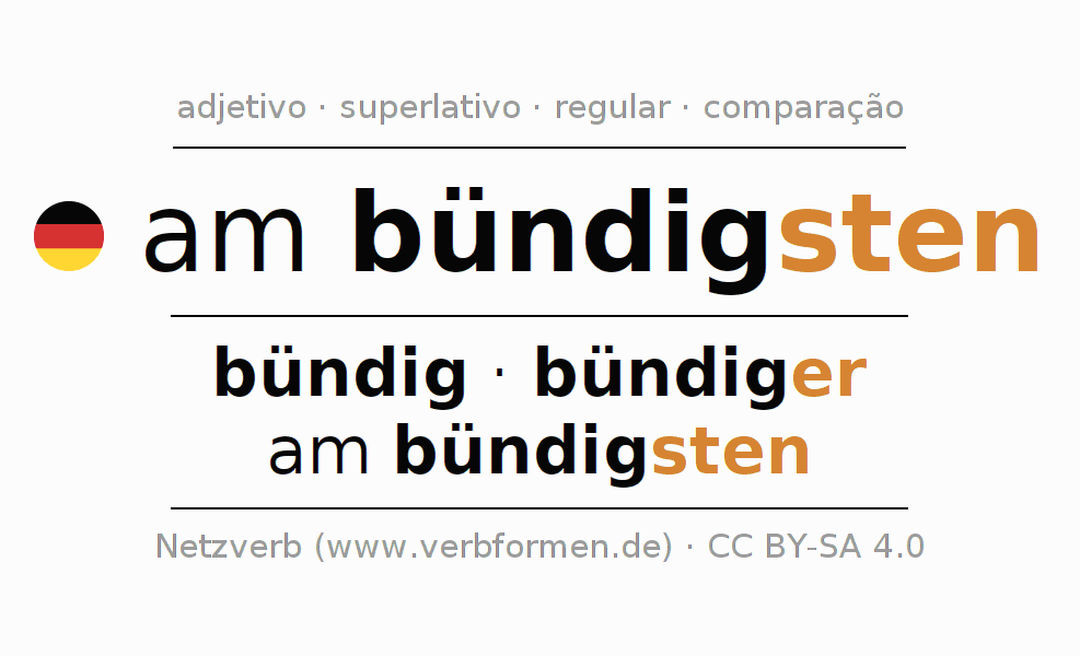 A declinação do adjetivo am bündigsten (conciso, preciso) utiliza as seguintes formas de comparação bündig,bündiger,am bündigsten. As terminações para o comparativo e o superlativo são er/sten. O adjectivo am bündigsten pode ser utilizado tanto como atributivo antes de um substantivo ou como predicativo junto com um verbo.Não se pode flexionar e comparar somente o adjetivo am bündigsten, mas sim todos os adjetivos em alemão. Comentários ☆