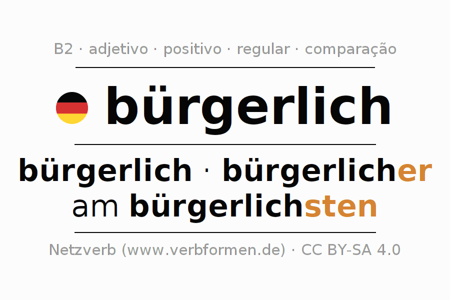 A declinação do adjetivo bürgerlich (burgues, burguesa) utiliza as seguintes formas de comparação bürgerlich,bürgerlicher,am bürgerlichsten. As terminações para o comparativo e o superlativo são er/sten. O adjectivo bürgerlich pode ser utilizado tanto como atributivo antes de um substantivo ou como predicativo junto com um verbo.Não se pode flexionar e comparar somente o adjetivo bürgerlich, mas sim todos os adjetivos em alemão. Comentários ☆
