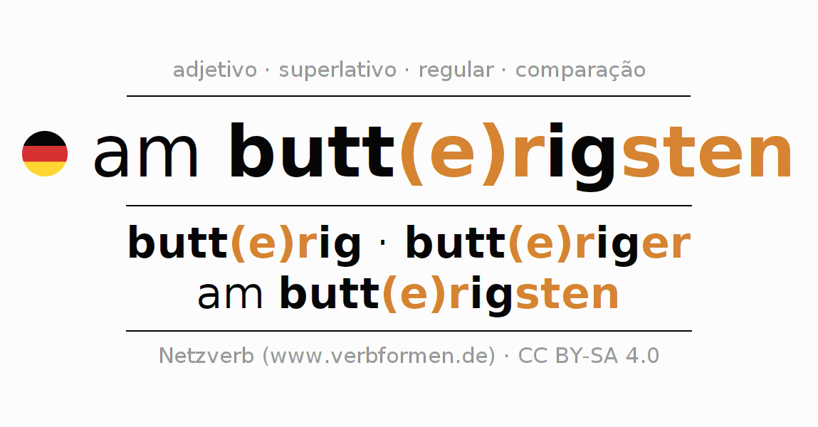 - Feminino: die butt(e)rigste, der butt(e)rigsten, der butt(e)rigsten, die butt(e)rigste