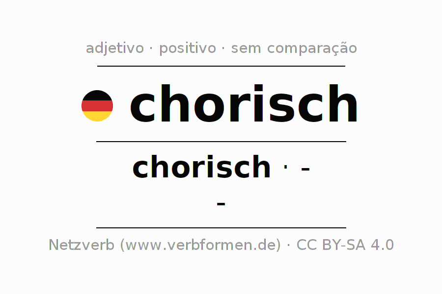 A declinação do adjetivo chorisch não forma o grau de comparação chorisch. O adjectivo não tem forma no comparativo e nem no superlativo. O adjectivo chorisch pode ser utilizado tanto como atributivo antes de um substantivo ou como predicativo junto com um verbo.Não se pode flexionar e comparar somente o adjetivo chorisch, mas sim todos os adjetivos em alemão. Comentários ☆