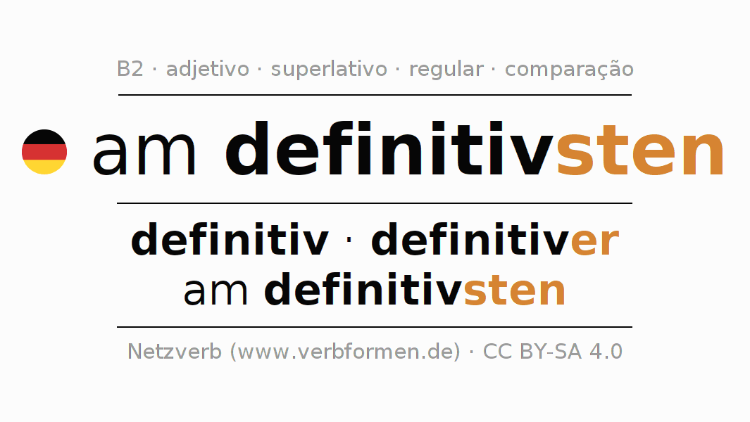 A declinação do adjetivo am definitivsten (definitivo) utiliza as seguintes formas de comparação definitiv,definitiver,am definitivsten. As terminações para o comparativo e o superlativo são er/sten. O adjectivo am definitivsten pode ser utilizado tanto como atributivo antes de um substantivo ou como predicativo junto com um verbo.Não se pode flexionar e comparar somente o adjetivo am definitivsten, mas sim todos os adjetivos em alemão. Comentários ☆