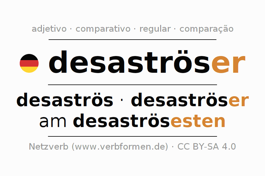 A declinação do adjetivo desaströser (catastrófico, desastroso) utiliza as seguintes formas de comparação desaströs,desaströser,am desaströsesten. As terminações para o comparativo e o superlativo são er/esten. O adjectivo desaströser pode ser utilizado tanto como atributivo antes de um substantivo ou como predicativo junto com um verbo.Não se pode flexionar e comparar somente o adjetivo desaströser, mas sim todos os adjetivos em alemão. Comentários ☆