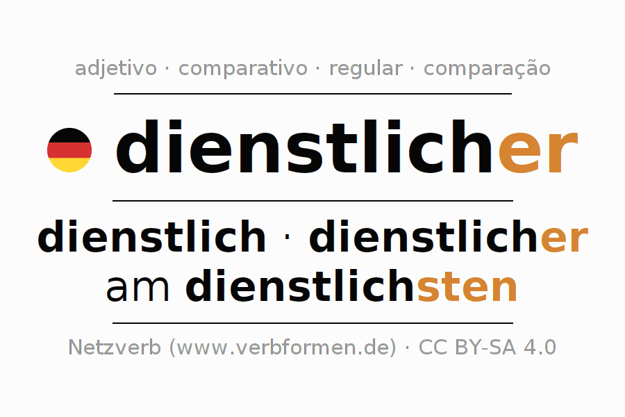 A declinação do adjetivo dienstlicher (profissional) utiliza as seguintes formas de comparação dienstlich,dienstlicher,am dienstlichsten. As terminações para o comparativo e o superlativo são er/sten. O adjectivo dienstlicher pode ser utilizado tanto como atributivo antes de um substantivo ou como predicativo junto com um verbo.Não se pode flexionar e comparar somente o adjetivo dienstlicher, mas sim todos os adjetivos em alemão. Comentários ☆