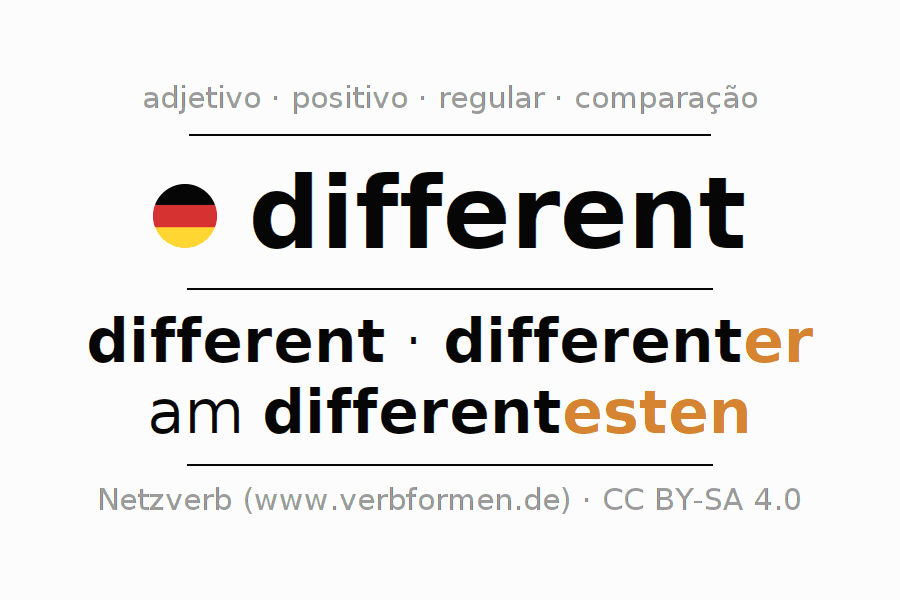 A declinação do adjetivo different (diferente) utiliza as seguintes formas de comparação different,differenter,am differentesten. As terminações para o comparativo e o superlativo são er/esten. O adjectivo different pode ser utilizado tanto como atributivo antes de um substantivo ou como predicativo junto com um verbo.Não se pode flexionar e comparar somente o adjetivo different, mas sim todos os adjetivos em alemão. Comentários ☆
