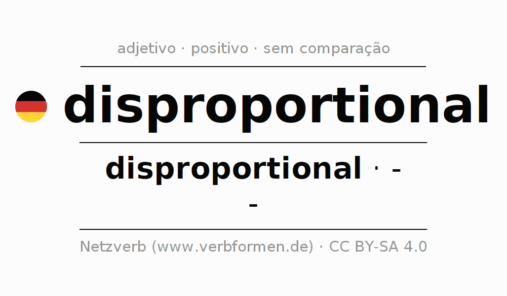 A declinação do adjetivo disproportional não forma o grau de comparação disproportional. O adjectivo não tem forma no comparativo e nem no superlativo. O adjectivo disproportional pode ser utilizado tanto como atributivo antes de um substantivo ou como predicativo junto com um verbo.Não se pode flexionar e comparar somente o adjetivo disproportional, mas sim todos os adjetivos em alemão. Comentários ☆