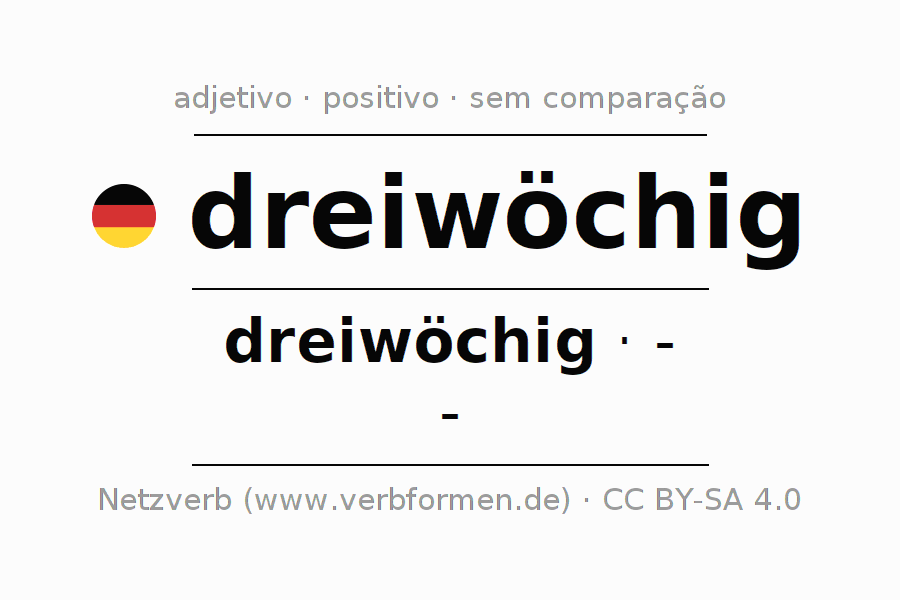 A declinação do adjetivo dreiwöchig não forma o grau de comparação dreiwöchig. O adjectivo não tem forma no comparativo e nem no superlativo. O adjectivo dreiwöchig pode ser utilizado tanto como atributivo antes de um substantivo ou como predicativo junto com um verbo.Não se pode flexionar e comparar somente o adjetivo dreiwöchig, mas sim todos os adjetivos em alemão. Comentários ☆
