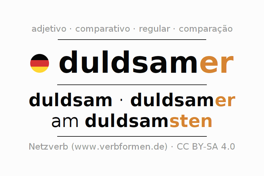 A declinação do adjetivo duldsamer (paciente, tolerante) utiliza as seguintes formas de comparação duldsam,duldsamer,am duldsamsten. As terminações para o comparativo e o superlativo são er/sten. O adjectivo duldsamer pode ser utilizado tanto como atributivo antes de um substantivo ou como predicativo junto com um verbo.Não se pode flexionar e comparar somente o adjetivo duldsamer, mas sim todos os adjetivos em alemão. Comentários ☆
