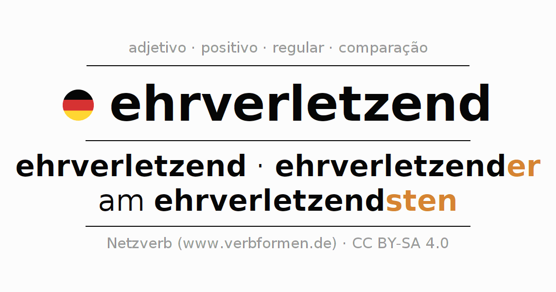 A declinação do adjetivo ehrverletzend (desonroso, ofensivo) utiliza as seguintes formas de comparação ehrverletzend,ehrverletzender,am ehrverletzendsten. As terminações para o comparativo e o superlativo são er/sten. O adjectivo ehrverletzend pode ser utilizado tanto como atributivo antes de um substantivo ou como predicativo junto com um verbo.Não se pode flexionar e comparar somente o adjetivo ehrverletzend, mas sim todos os adjetivos em alemão. Comentários ☆