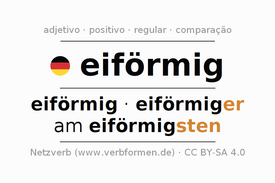 A declinação do adjetivo eiförmig (ovóide, oval) utiliza as seguintes formas de comparação eiförmig,eiförmiger,am eiförmigsten. As terminações para o comparativo e o superlativo são er/sten. O adjectivo eiförmig pode ser utilizado tanto como atributivo antes de um substantivo ou como predicativo junto com um verbo.Não se pode flexionar e comparar somente o adjetivo eiförmig, mas sim todos os adjetivos em alemão. Comentários ☆