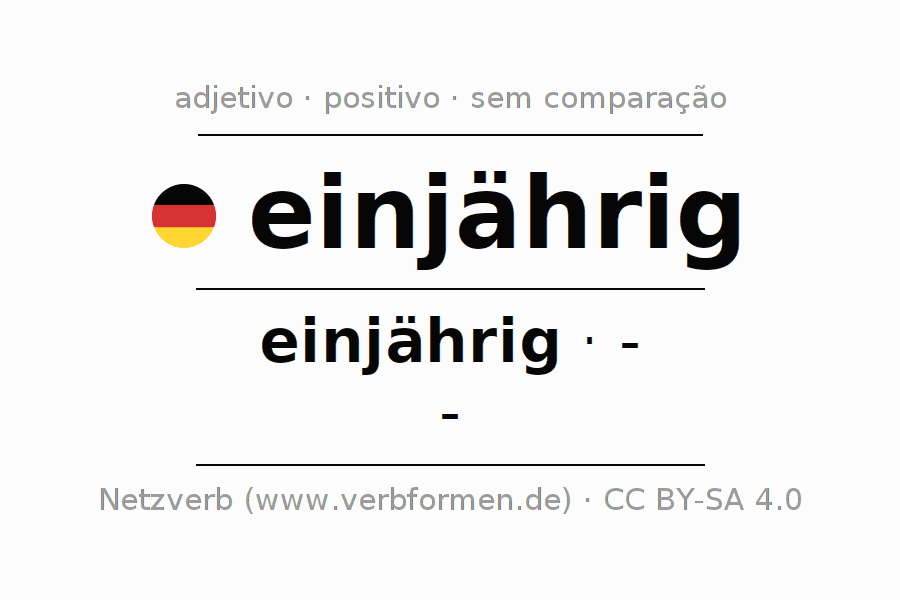 A declinação do adjetivo einjährig não forma o grau de comparação einjährig. O adjectivo não tem forma no comparativo e nem no superlativo. O adjectivo einjährig pode ser utilizado tanto como atributivo antes de um substantivo ou como predicativo junto com um verbo.Não se pode flexionar e comparar somente o adjetivo einjährig, mas sim todos os adjetivos em alemão. Comentários ☆