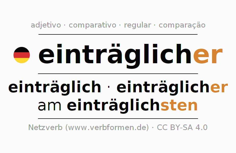 A declinação do adjetivo einträglicher (lucrativo, rentável) utiliza as seguintes formas de comparação einträglich,einträglicher,am einträglichsten. As terminações para o comparativo e o superlativo são er/sten. O adjectivo einträglicher pode ser utilizado tanto como atributivo antes de um substantivo ou como predicativo junto com um verbo.Não se pode flexionar e comparar somente o adjetivo einträglicher, mas sim todos os adjetivos em alemão. Comentários ☆