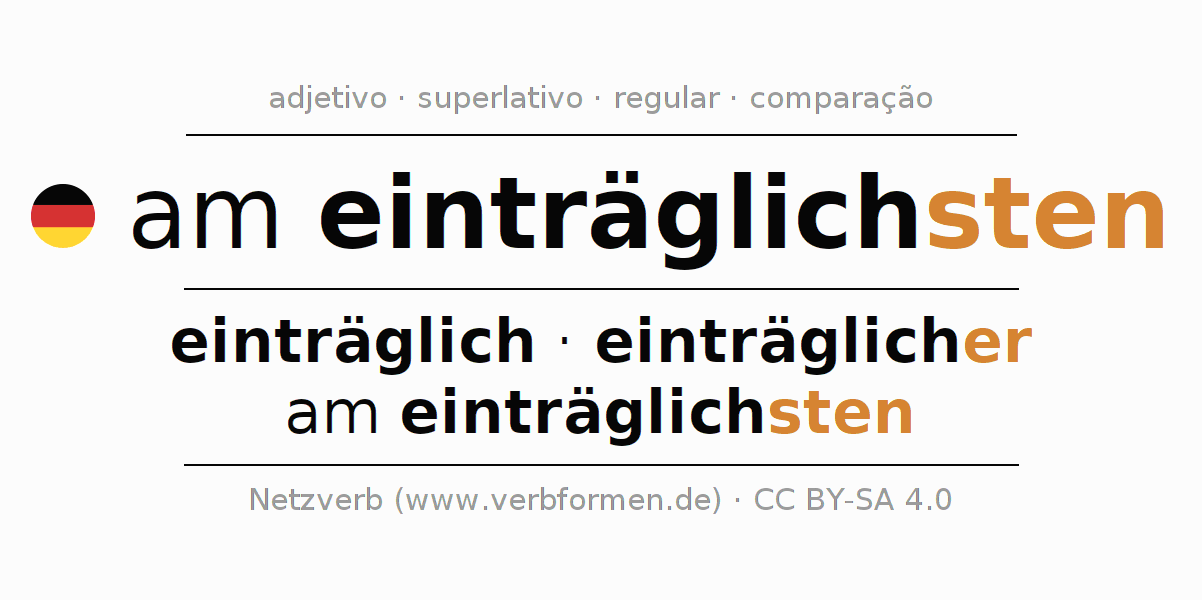 A declinação do adjetivo am einträglichsten (lucrativo, rentável) utiliza as seguintes formas de comparação einträglich,einträglicher,am einträglichsten. As terminações para o comparativo e o superlativo são er/sten. O adjectivo am einträglichsten pode ser utilizado tanto como atributivo antes de um substantivo ou como predicativo junto com um verbo.Não se pode flexionar e comparar somente o adjetivo am einträglichsten, mas sim todos os adjetivos em alemão. Comentários ☆