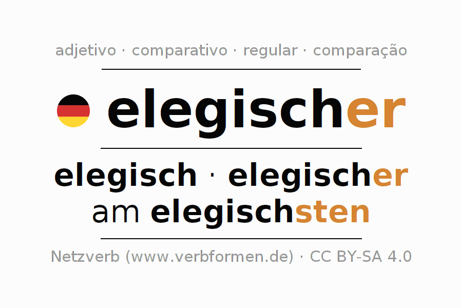 A declinação do adjetivo elegischer (melancólico, triste) utiliza as seguintes formas de comparação elegisch,elegischer,am elegischsten. As terminações para o comparativo e o superlativo são er/sten. O adjectivo elegischer pode ser utilizado tanto como atributivo antes de um substantivo ou como predicativo junto com um verbo.Não se pode flexionar e comparar somente o adjetivo elegischer, mas sim todos os adjetivos em alemão. Comentários ☆