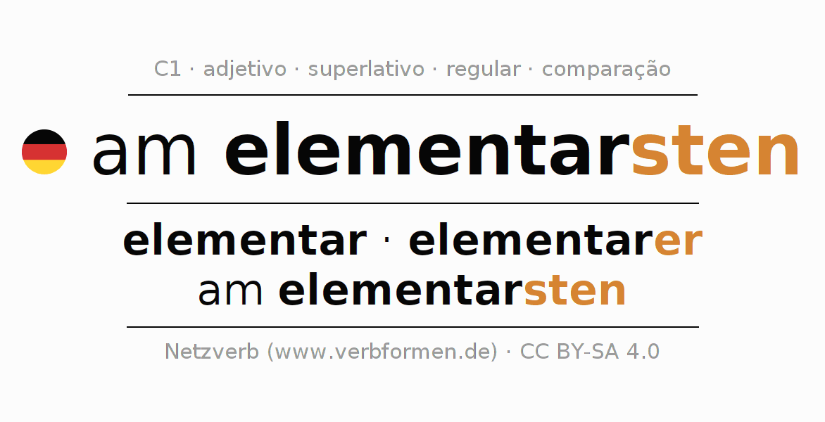 A declinação e o comparativo de am elementarsten são apresentados online em tabelas em todas as formas: forte, fraca e mista. Assim como no singular e no plural. Também são apresentados os 4 casos: nominativo (auch 1. Fall, Wer-Fall), genitivo (auch 2. Fall, Wes-Fall, Wessen-Fall), dativo (auch3. Fall, Wem-Fall) e acusativo (auch4. Fall, Wen-Fall). Mais informações podem ser encontradas em Wiktionary am elementarsten e am elementarsten no Duden.