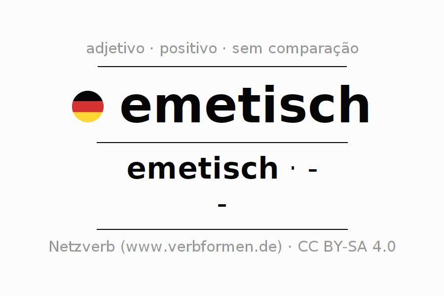 A declinação do adjetivo emetisch não forma o grau de comparação emetisch. O adjectivo não tem forma no comparativo e nem no superlativo. O adjectivo emetisch pode ser utilizado tanto como atributivo antes de um substantivo ou como predicativo junto com um verbo.Não se pode flexionar e comparar somente o adjetivo emetisch, mas sim todos os adjetivos em alemão. Comentários ☆