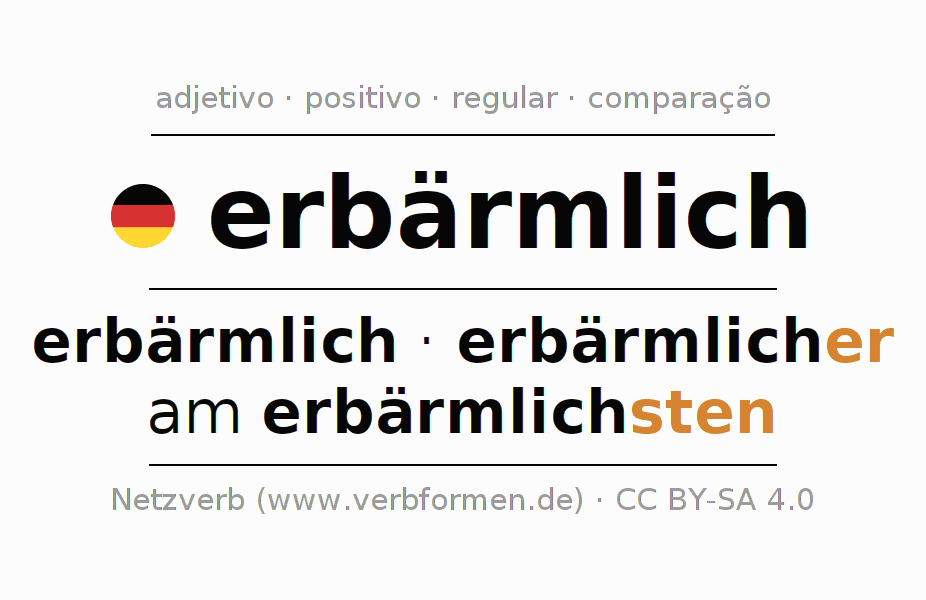 A declinação do adjetivo erbärmlich (lamentável, miserável) utiliza as seguintes formas de comparação erbärmlich,erbärmlicher,am erbärmlichsten. As terminações para o comparativo e o superlativo são er/sten. O adjectivo erbärmlich pode ser utilizado tanto como atributivo antes de um substantivo ou como predicativo junto com um verbo.Não se pode flexionar e comparar somente o adjetivo erbärmlich, mas sim todos os adjetivos em alemão. Comentários ☆
