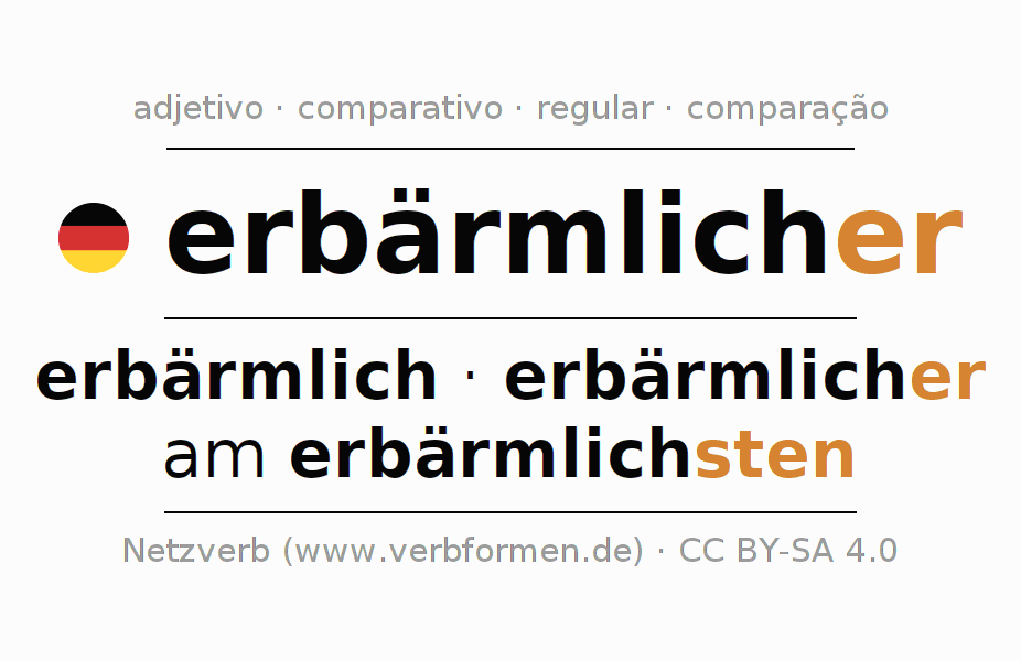 A declinação do adjetivo erbärmlicher (lamentável, miserável) utiliza as seguintes formas de comparação erbärmlich,erbärmlicher,am erbärmlichsten. As terminações para o comparativo e o superlativo são er/sten. O adjectivo erbärmlicher pode ser utilizado tanto como atributivo antes de um substantivo ou como predicativo junto com um verbo.Não se pode flexionar e comparar somente o adjetivo erbärmlicher, mas sim todos os adjetivos em alemão. Comentários ☆