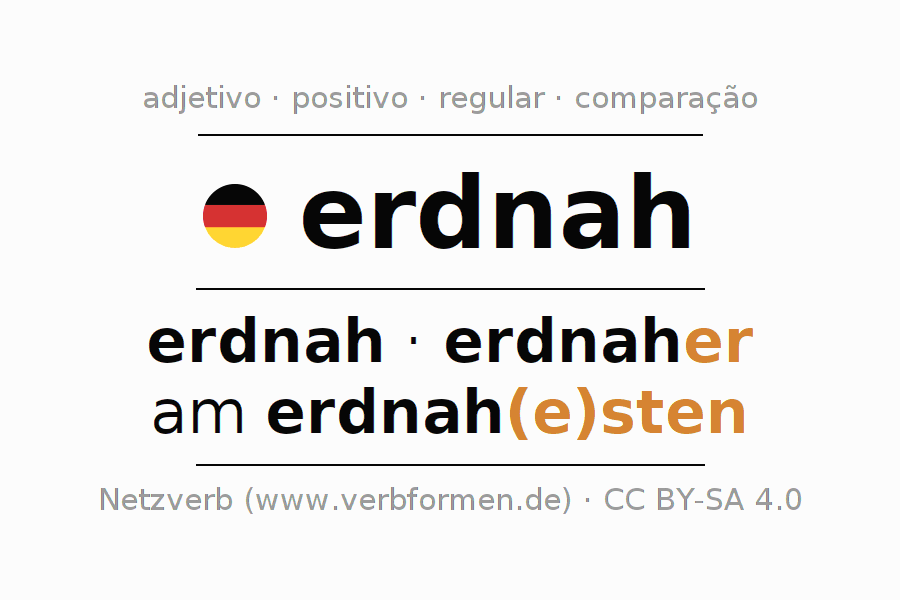 A declinação do adjetivo erdnah (próximo da Terra, próximo da terra) utiliza as seguintes formas de comparação erdnah,erdnaher,am erdnahesten. As terminações para o comparativo e o superlativo são er/esten. O adjectivo erdnah pode ser utilizado tanto como atributivo antes de um substantivo ou como predicativo junto com um verbo.Não se pode flexionar e comparar somente o adjetivo erdnah, mas sim todos os adjetivos em alemão. Comentários ☆