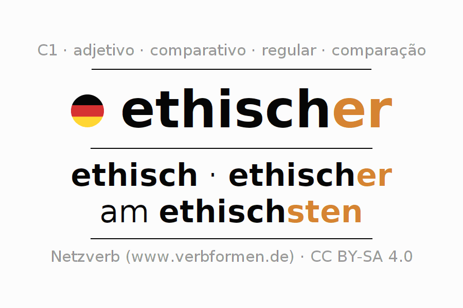 A declinação do adjetivo ethischer (ético) utiliza as seguintes formas de comparação ethisch,ethischer,am ethischsten. As terminações para o comparativo e o superlativo são er/sten. O adjectivo ethischer pode ser utilizado tanto como atributivo antes de um substantivo ou como predicativo junto com um verbo.Não se pode flexionar e comparar somente o adjetivo ethischer, mas sim todos os adjetivos em alemão. Comentários ☆