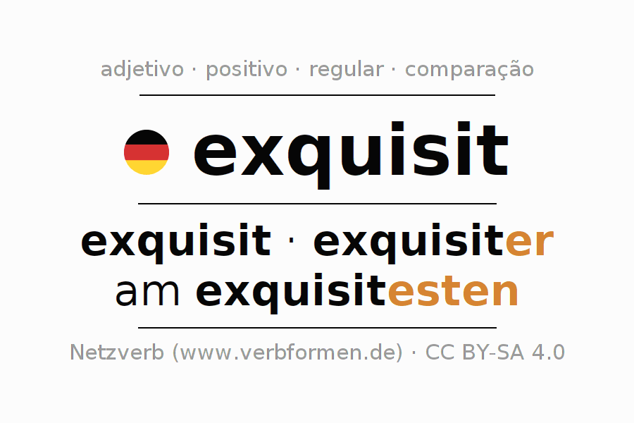 A declinação do adjetivo exquisit (excelente, excepcional) utiliza as seguintes formas de comparação exquisit,exquisiter,am exquisitesten. As terminações para o comparativo e o superlativo são er/esten. O adjectivo exquisit pode ser utilizado tanto como atributivo antes de um substantivo ou como predicativo junto com um verbo.Não se pode flexionar e comparar somente o adjetivo exquisit, mas sim todos os adjetivos em alemão. Comentários ☆