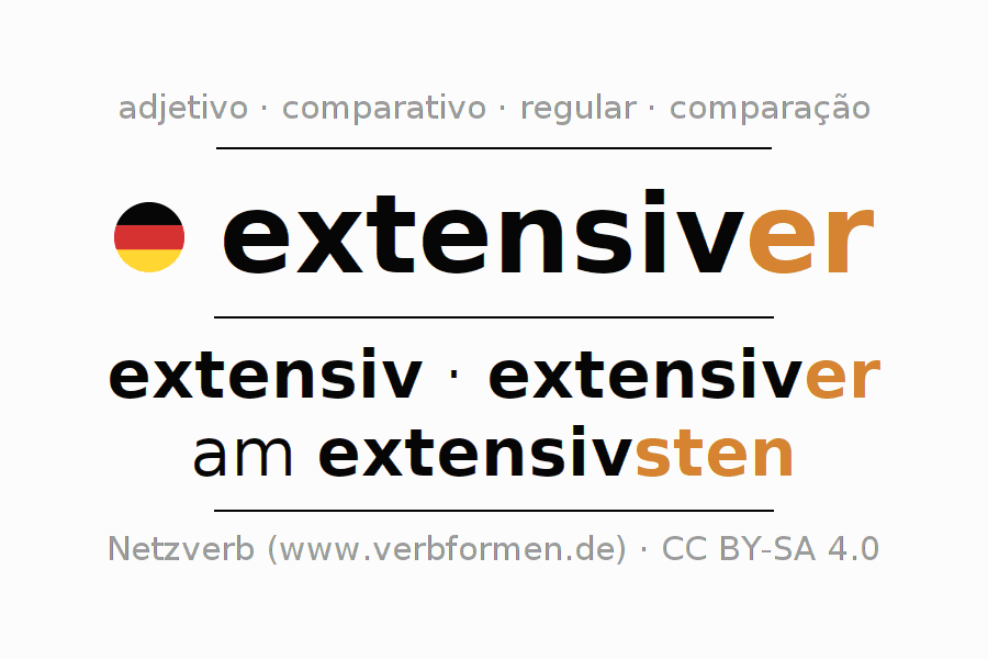 A declinação do adjetivo extensiver (extensivo, abrangente) utiliza as seguintes formas de comparação extensiv,extensiver,am extensivsten. As terminações para o comparativo e o superlativo são er/sten. O adjectivo extensiver pode ser utilizado tanto como atributivo antes de um substantivo ou como predicativo junto com um verbo.Não se pode flexionar e comparar somente o adjetivo extensiver, mas sim todos os adjetivos em alemão. Comentários ☆