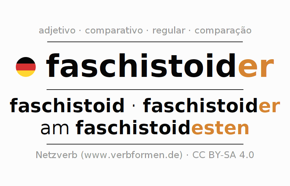 A declinação do adjetivo faschistoider (fascista, semelhante ao fascismo) utiliza as seguintes formas de comparação faschistoid,faschistoider,am faschistoidesten. As terminações para o comparativo e o superlativo são er/esten. O adjectivo faschistoider pode ser utilizado tanto como atributivo antes de um substantivo ou como predicativo junto com um verbo.Não se pode flexionar e comparar somente o adjetivo faschistoider, mas sim todos os adjetivos em alemão. Comentários ☆