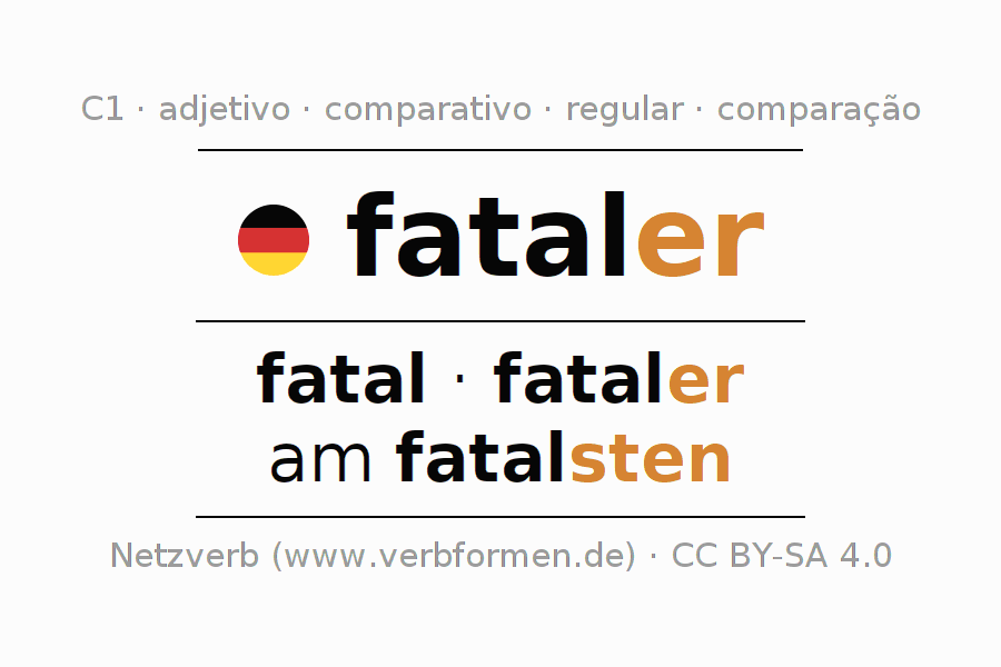 A declinação do adjetivo fataler (desastroso, trágico) utiliza as seguintes formas de comparação fatal,fataler,am fatalsten. As terminações para o comparativo e o superlativo são er/sten. O adjectivo fataler pode ser utilizado tanto como atributivo antes de um substantivo ou como predicativo junto com um verbo.Não se pode flexionar e comparar somente o adjetivo fataler, mas sim todos os adjetivos em alemão. Comentários ☆
