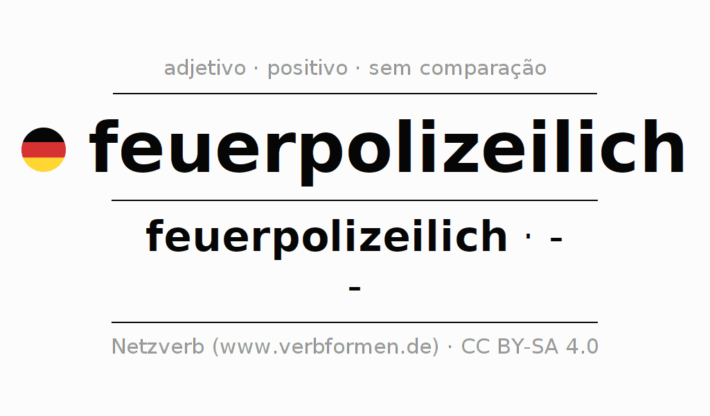 A declinação do adjetivo feuerpolizeilich não forma o grau de comparação feuerpolizeilich. O adjectivo não tem forma no comparativo e nem no superlativo. O adjectivo feuerpolizeilich pode ser utilizado tanto como atributivo antes de um substantivo ou como predicativo junto com um verbo.Não se pode flexionar e comparar somente o adjetivo feuerpolizeilich, mas sim todos os adjetivos em alemão. Comentários ☆