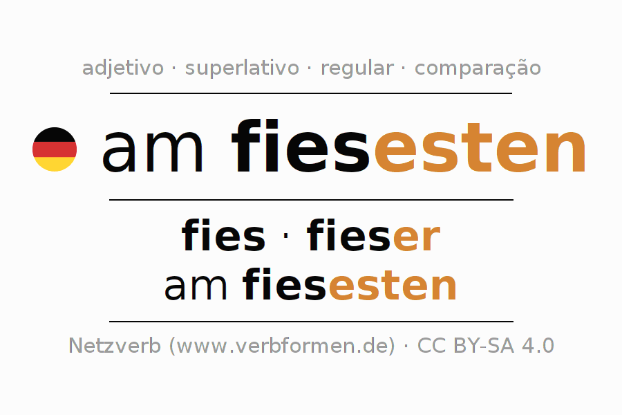 A declinação do adjetivo am fiesesten (desagradável, nojento) utiliza as seguintes formas de comparação fies,fieser,am fiesesten. As terminações para o comparativo e o superlativo são er/esten. O adjectivo am fiesesten pode ser utilizado tanto como atributivo antes de um substantivo ou como predicativo junto com um verbo.Não se pode flexionar e comparar somente o adjetivo am fiesesten, mas sim todos os adjetivos em alemão. Comentários ☆
